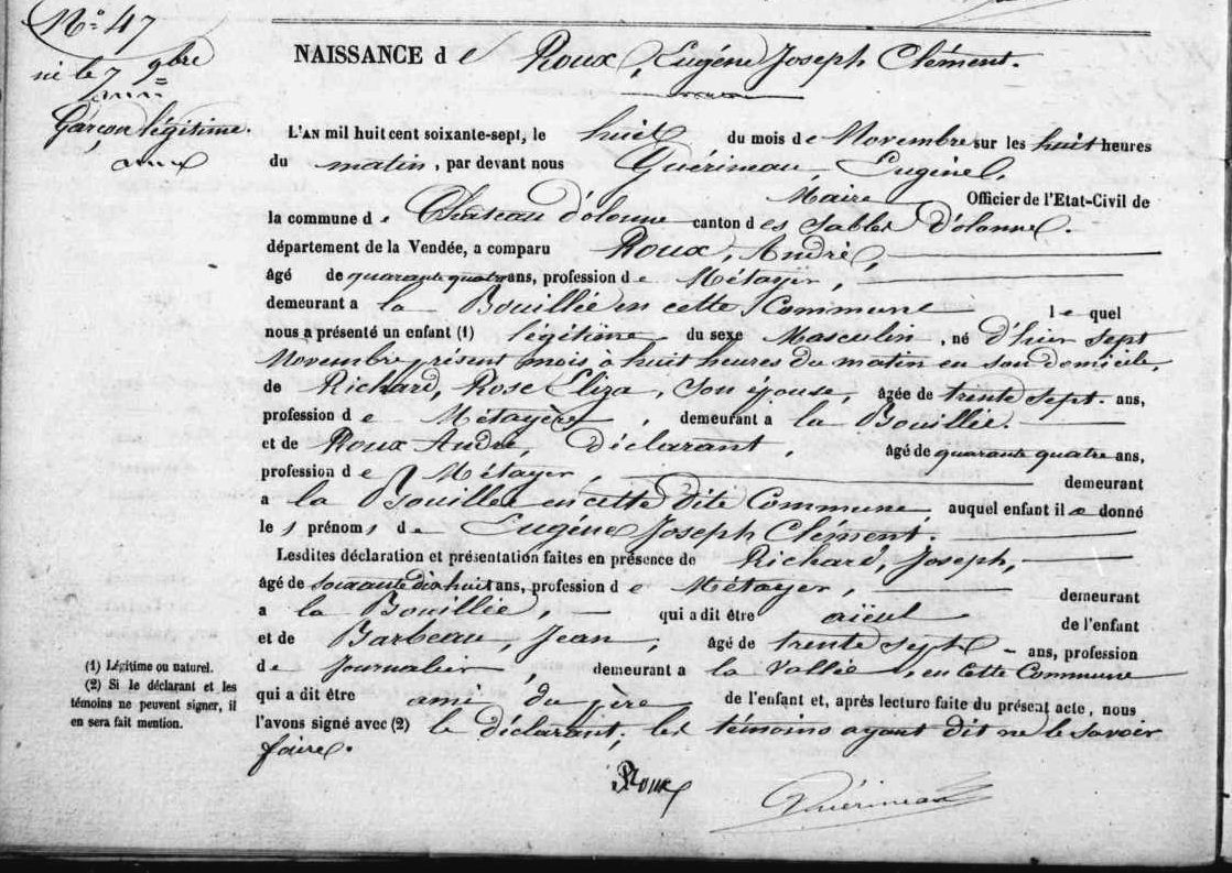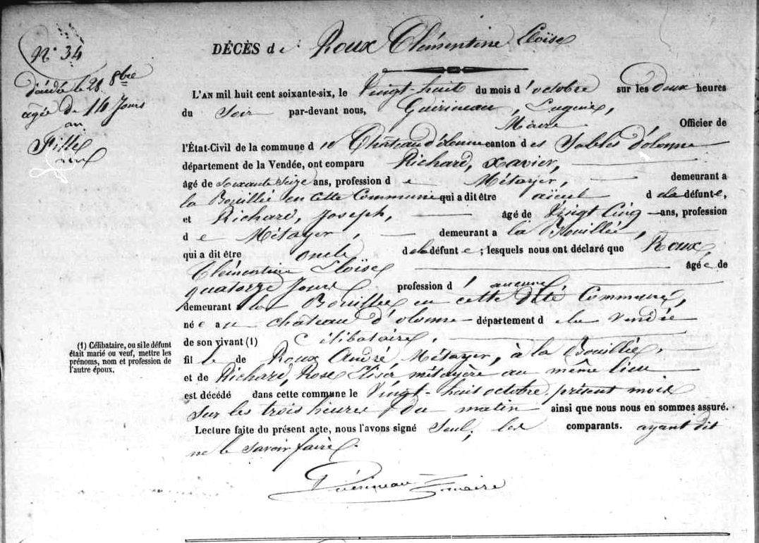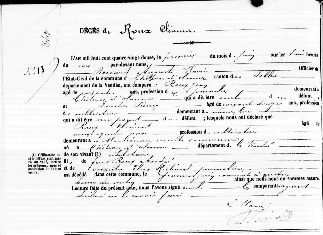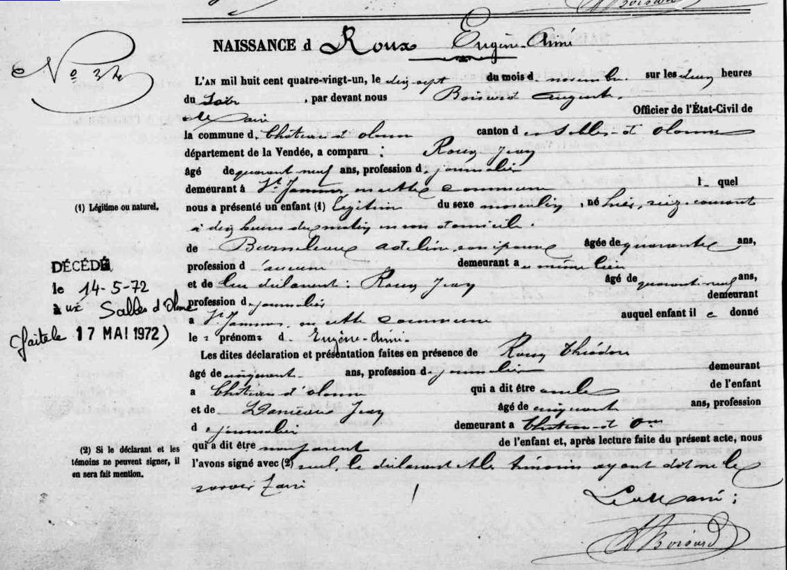 Naissance : 1868 Décès : 1er juin 1892 à Château-d'Olonne 85180 Moulineau