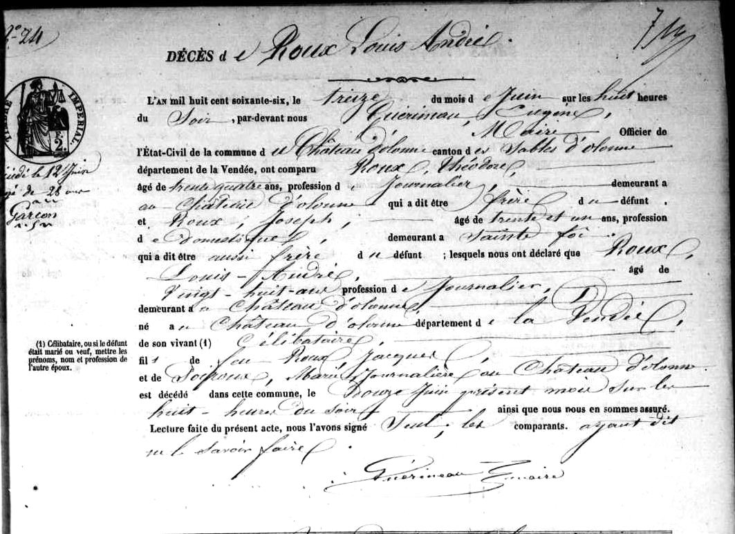 Naissance : calculée 1838 Décès : 12 juin 1866 à Château-d'Olonne 85180