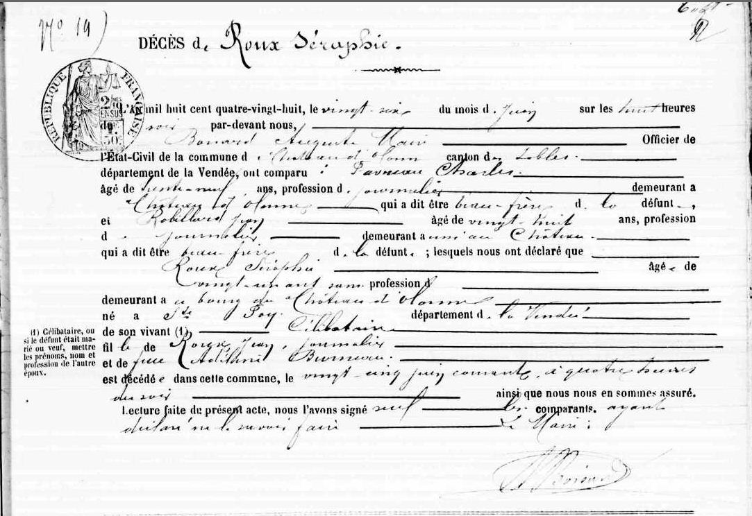 Naissance : calculée 1867 à Sainte-Foy 85150 Décès : 25 juin 1888 à Château-d'Olonne 85180