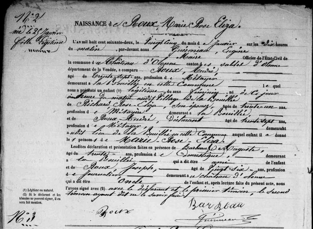 Naissance : 1778 à Château-d'Olonne 85180 Baptême : 15 novembre 1778 à Château-d'Olonne 85180