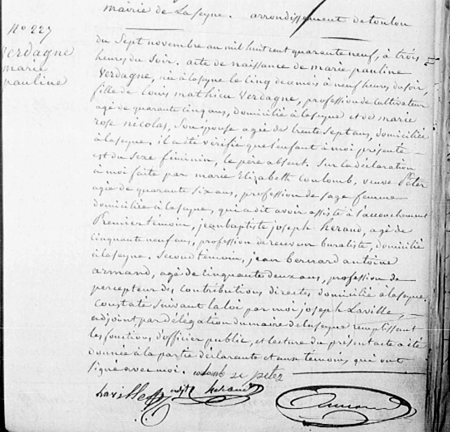 déclarée par Coulomb Marie Elisabeth 46 ans sage-femme à La Seyne