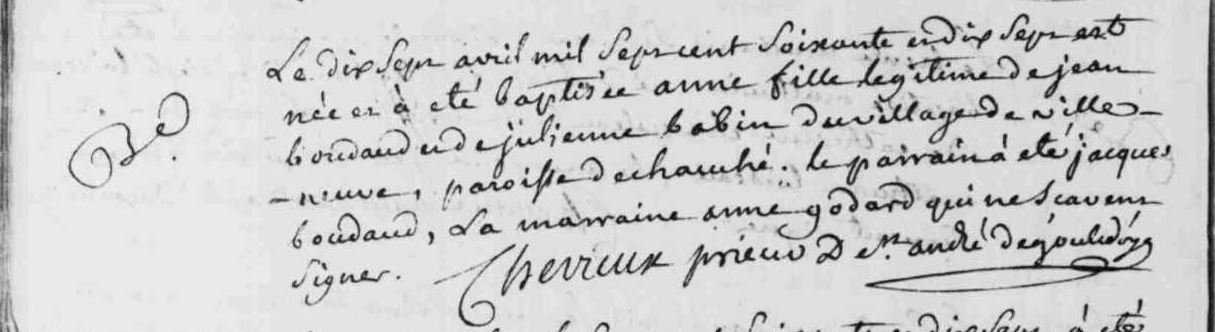 Naissance : 24 mars 1690 à Saint-André-Goule-d'Oie 85250 Décès : 18 novembre 1721 à Saint-Fulgent 85250