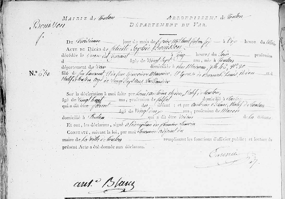 Naissance : 1778 à Toulon 83000 Décès : 2 février 1806 à Toulon 83000 rue Mairaud n°20