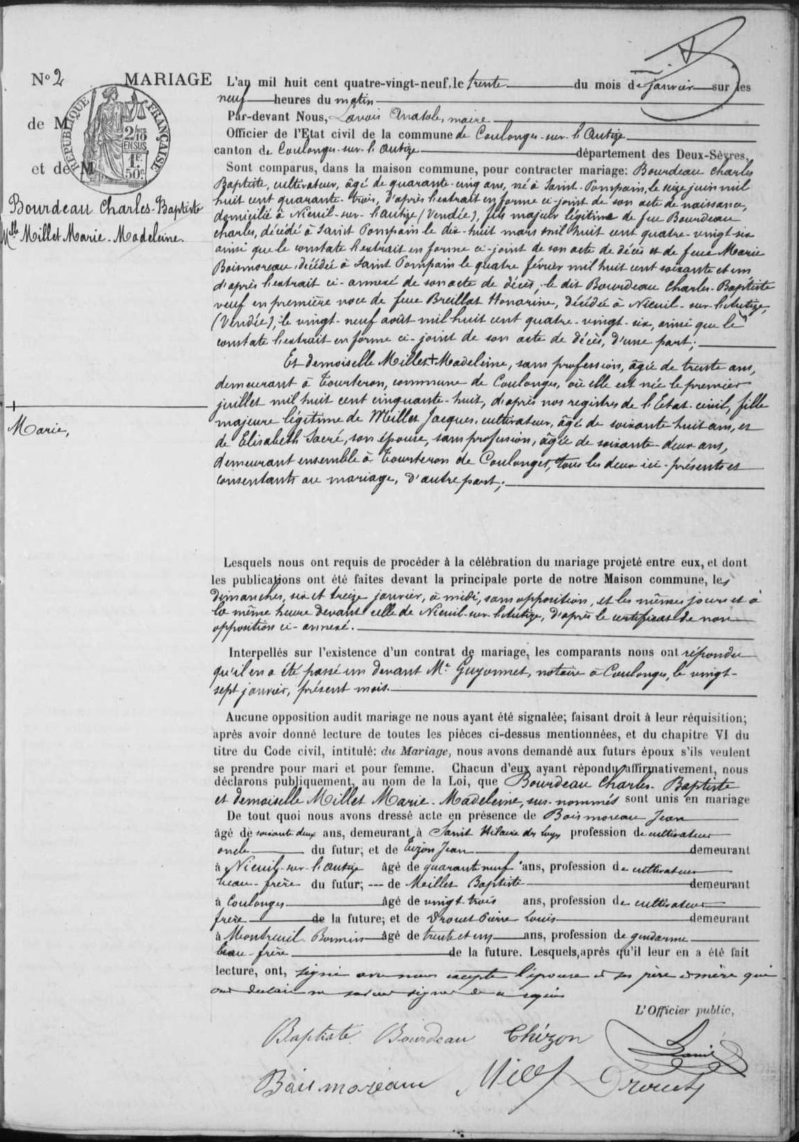 Union 2 : MILLET Marie Madeleine ( 1858 - ? )