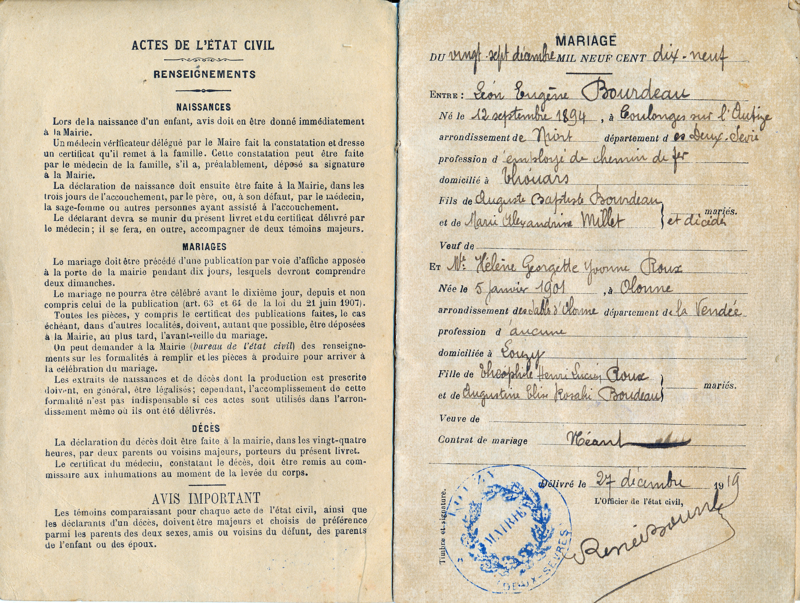 Union : ROUX Hélène Georgette Yvonne ( 1901 - 1991 )