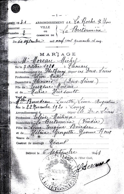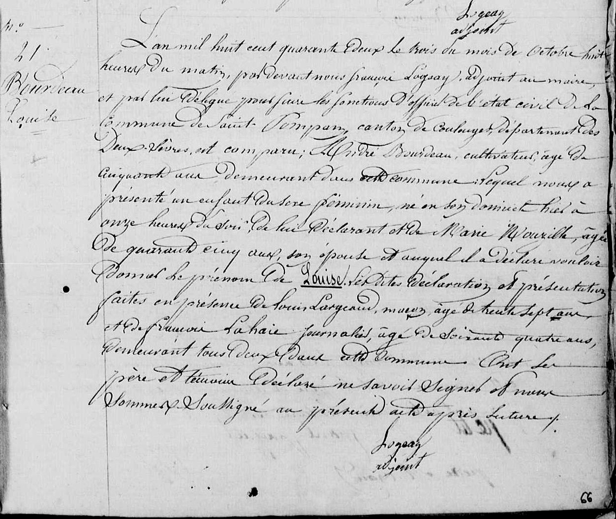 Naissance : 22 novembre 1791 à Saint-Pompain 79160 Baptême : 24 novembre 1791 à Saint-Pompain 79160