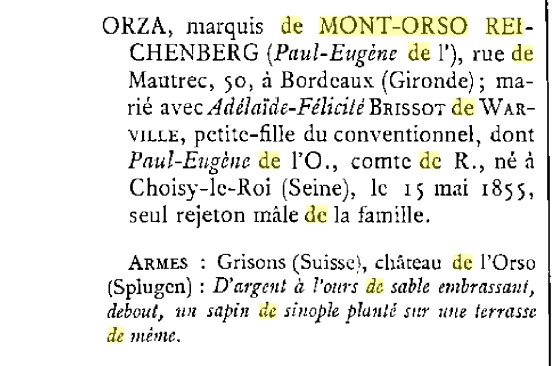 Enfant : L'ORZA de MONTORZO-REICHENBERG (de ) Paul Eugène Charles ( 1855 - ? )