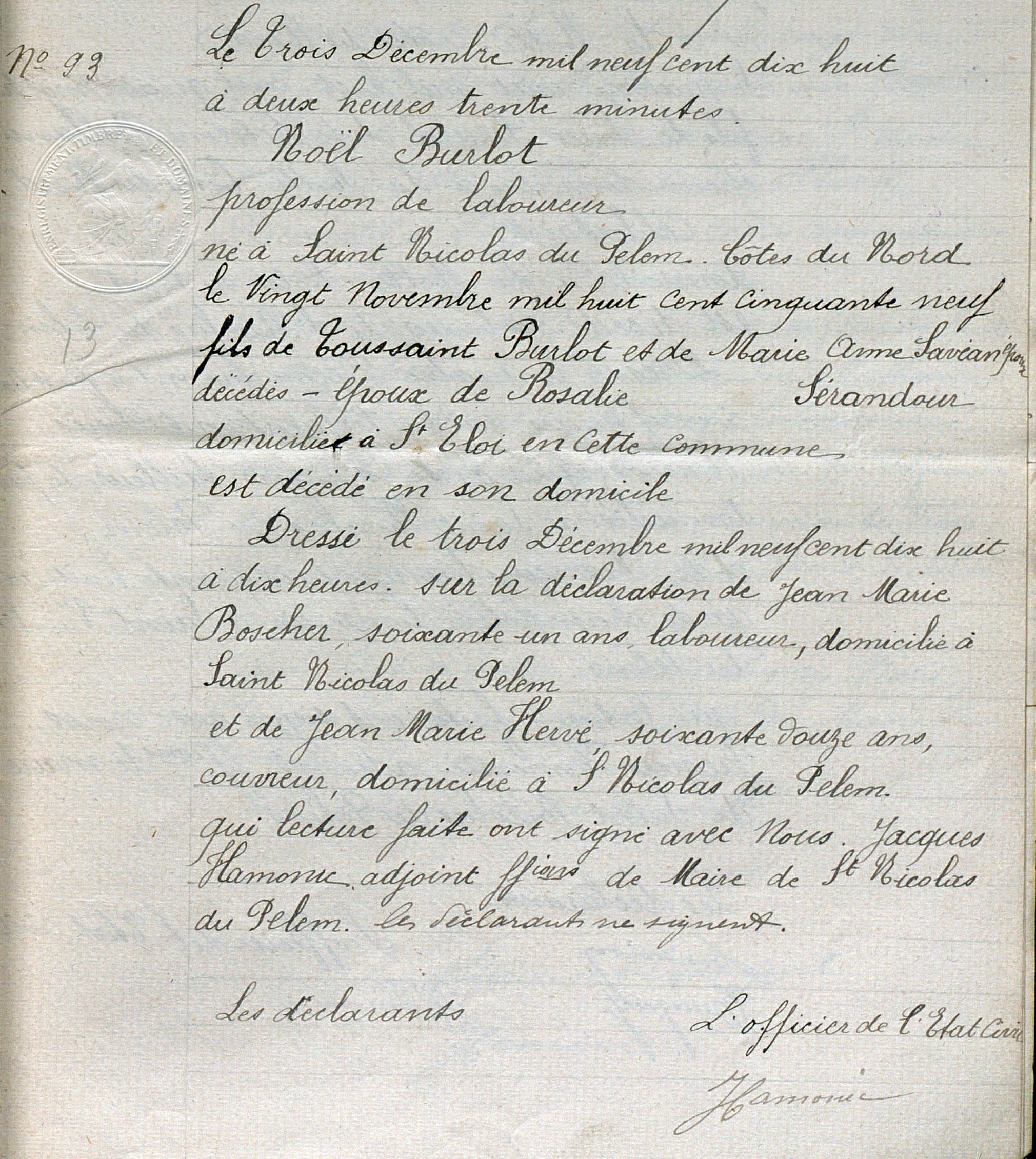 Naissance : 21 avril 1855 à Saint-Nicolas-du-Pélem 22480 Décès : après 1914