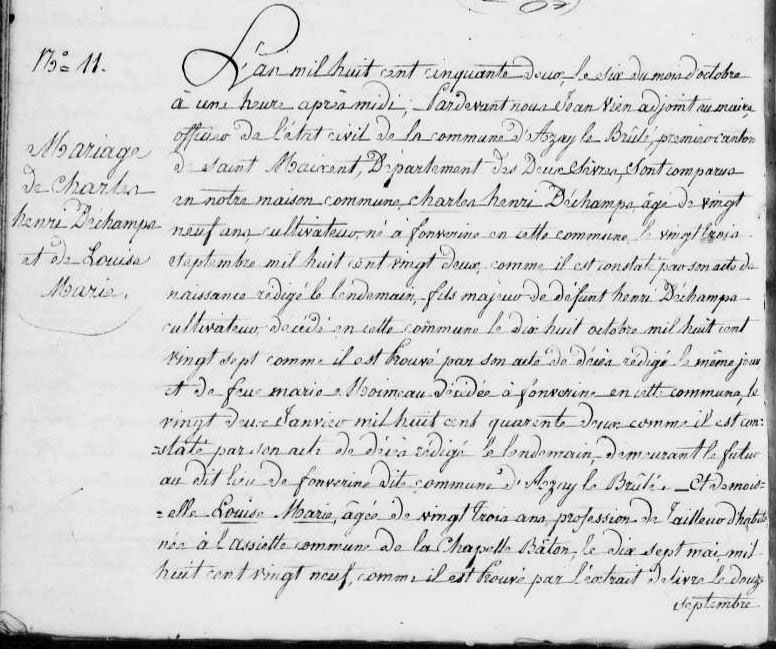 Mariage : 6 octobre 1852 à Azay-le-Brûlé 79400 Fonvérine