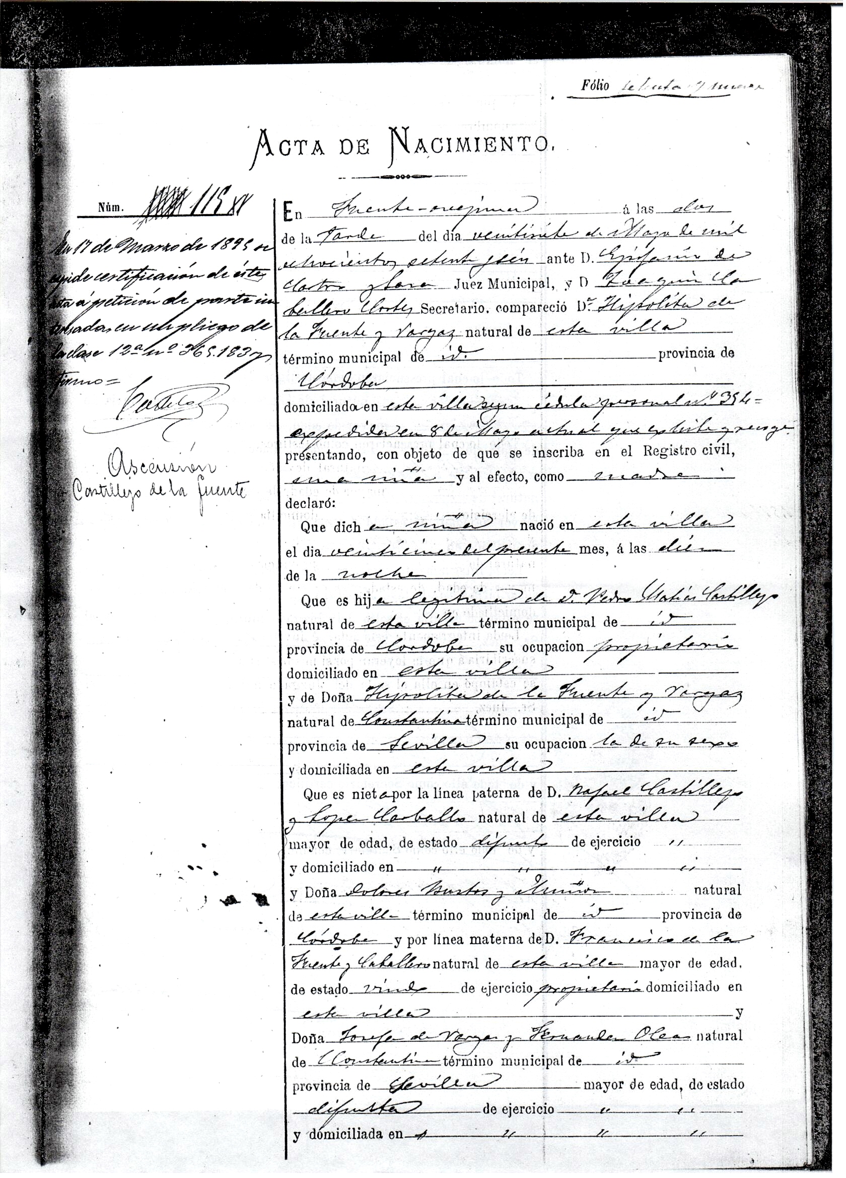 Baptême : 14 août 1900 à Córdoba 14001 Parroquia de Santo Domingo de Silos