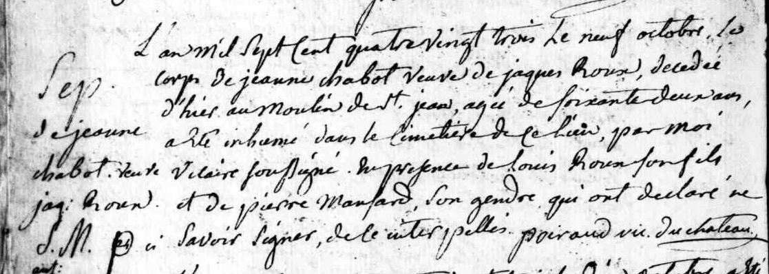 Naissance : calculée 1721 Décès : 8 octobre 1783 à Château-d'Olonne 85180 Moulin de St Jean