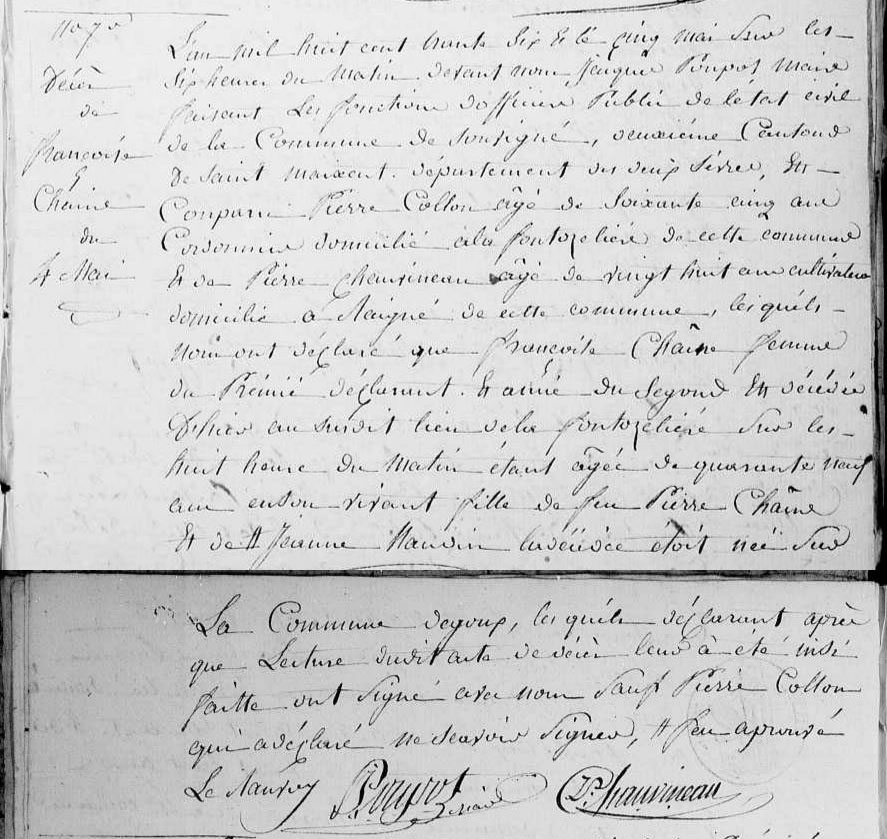 Naissance : 12 mai 1787 à La Couarde 79800 Goux (anc. commune) village de l'Erable Décès : 4 mai 1836 à Souvigné 79800 Fontozelière