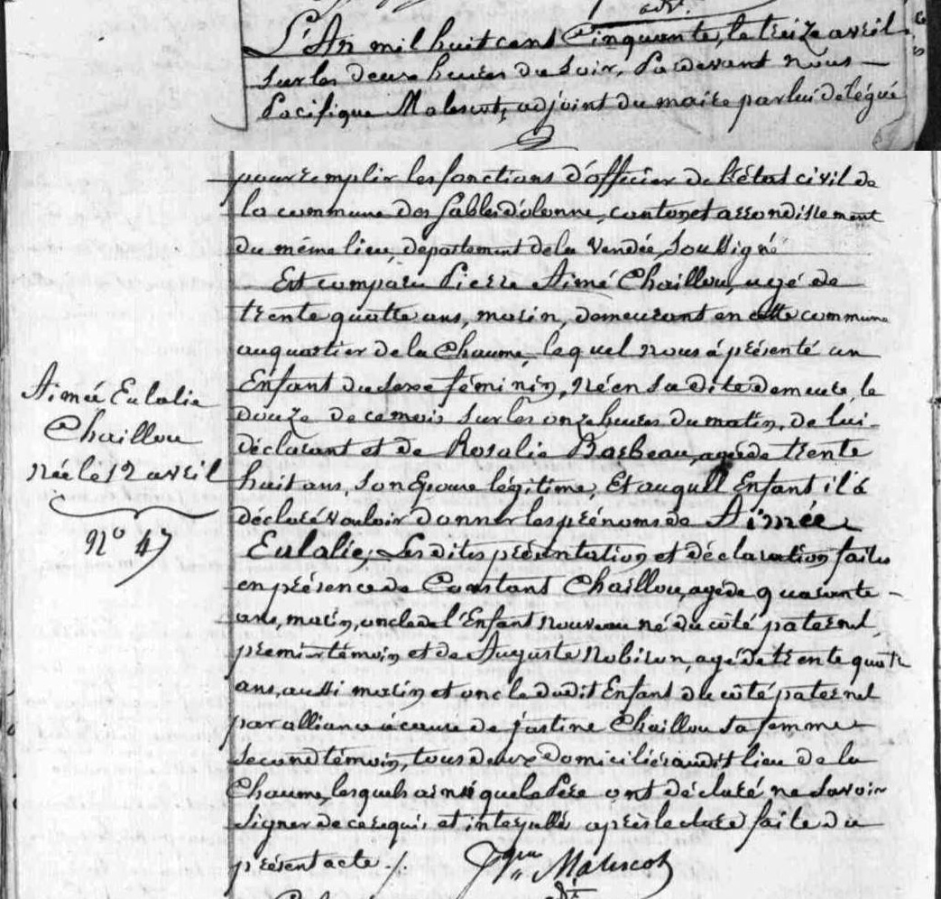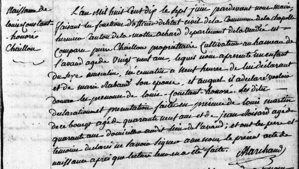 Naissance : 7 juin 1810 à La Chapelle-Hermier 85220 l' Avant