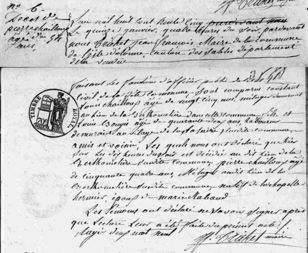 Naissance : 1817 Décès : 8 janvier 1835 à L'Île-d'Olonne 85340 la Berthomelière