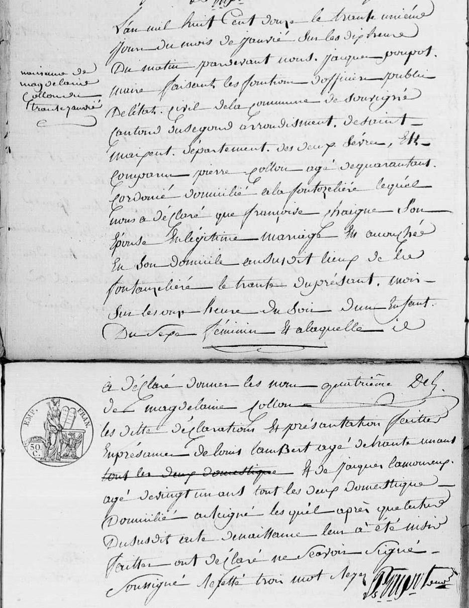 Naissance : 30 janvier 1812 à Souvigné 79800 La Fontanelière