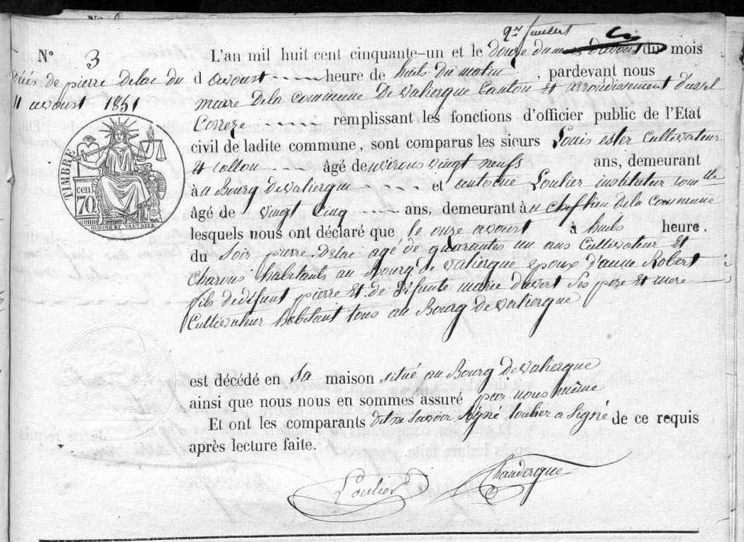 Naissance : 10 janvier 1836 à Valiergues 19200 Décès : 5 avril 1854 à Valiergues 19200