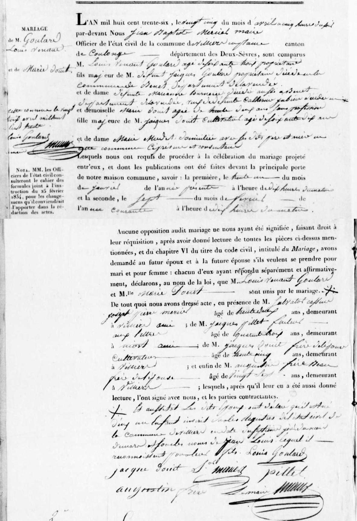 Naissance : 7 mars 1836 à Villiers-en-Plaine 79160 chez Jacques Douit