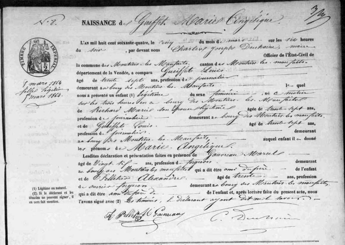 Naissance : 5 mars 1864 à Moutiers-les-Mauxfaits 85540