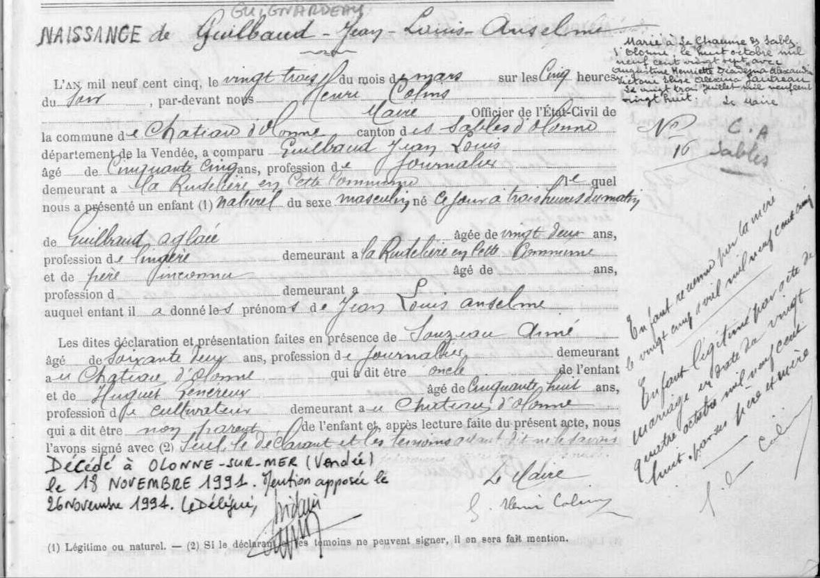né sous le nom de Guilbaud Jean Louis Anselme de père inconnu, reconnu au mariage de sa mère