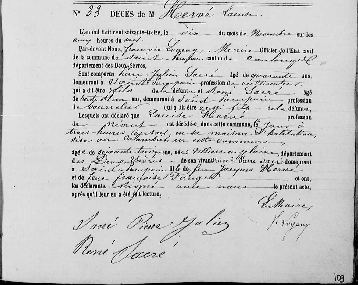 Naissance : 25 mars 1725 à Saint-Pompain 79160 Décès : 25 mai 1783 à Villiers-en-Plaine 79160