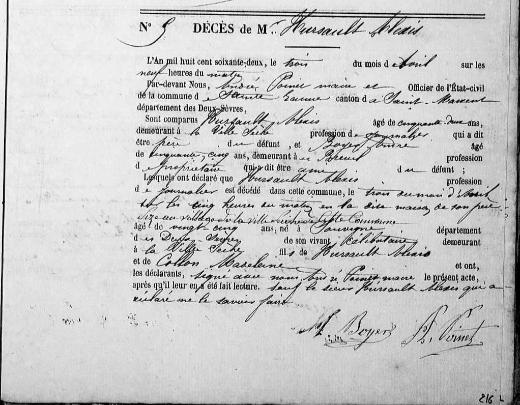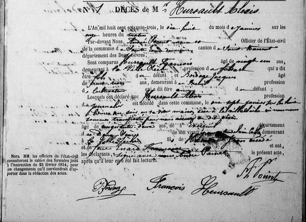 Décès : 17 janvier 1863 à Sainte-Eanne 79800 La Ville Sèche