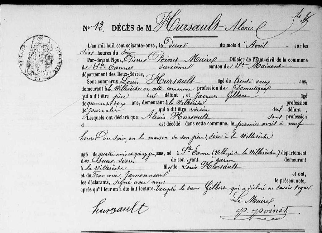 Décès : 1er avril 1871 à Sainte-Eanne 79800 La Ville Sèche