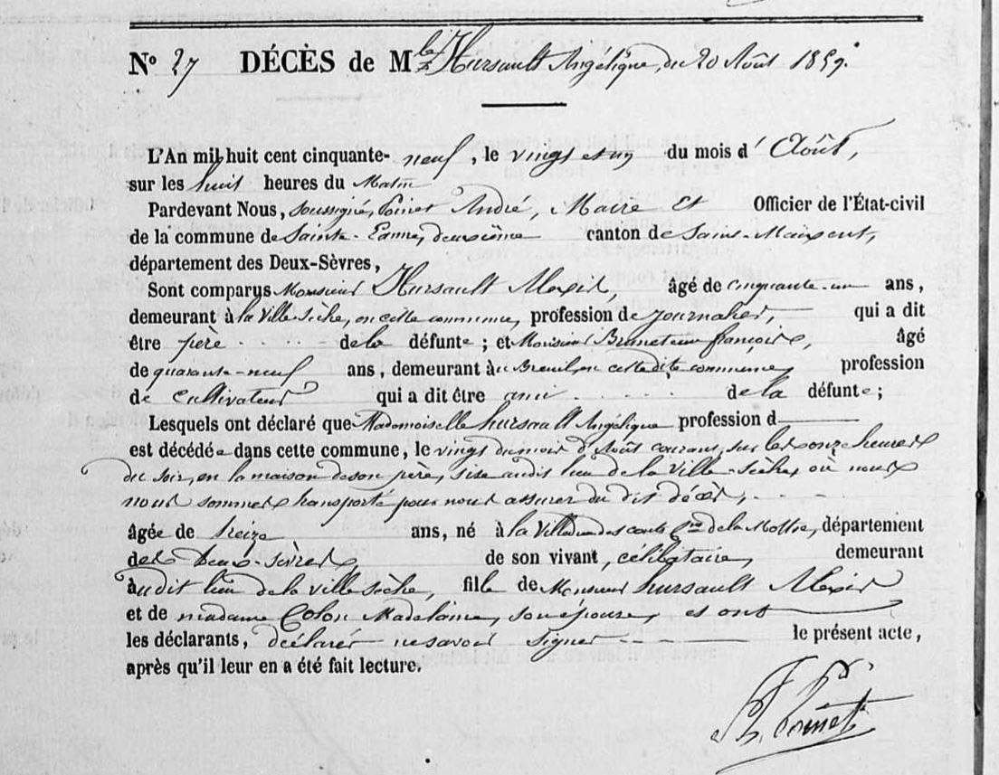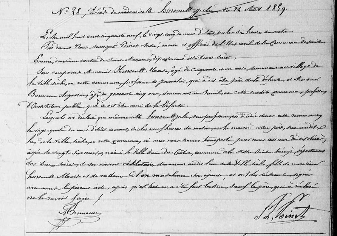 Décès : 24 août 1859 à Sainte-Eanne 79800 La Ville Sèche