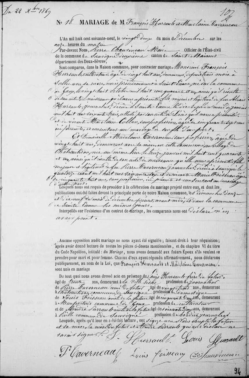Mariage : 22 décembre 1869 à Souvigné 79800