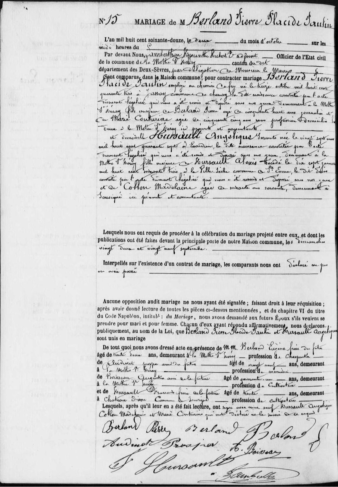 Mariage : 2 octobre 1872 à La Mothe-Saint-Héray 79800