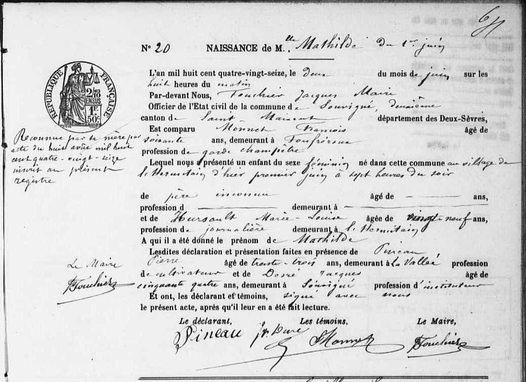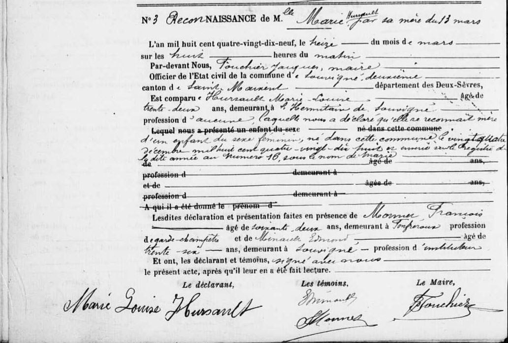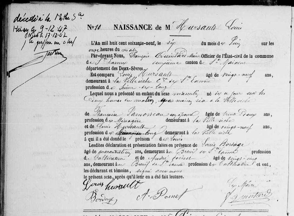 Naissance : 6 juin 1869 à Sainte-Eanne 79800 La Ville Sèche