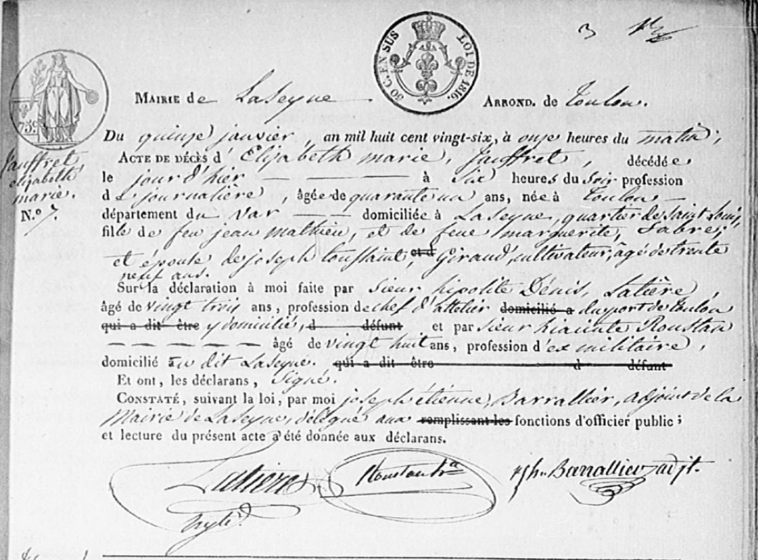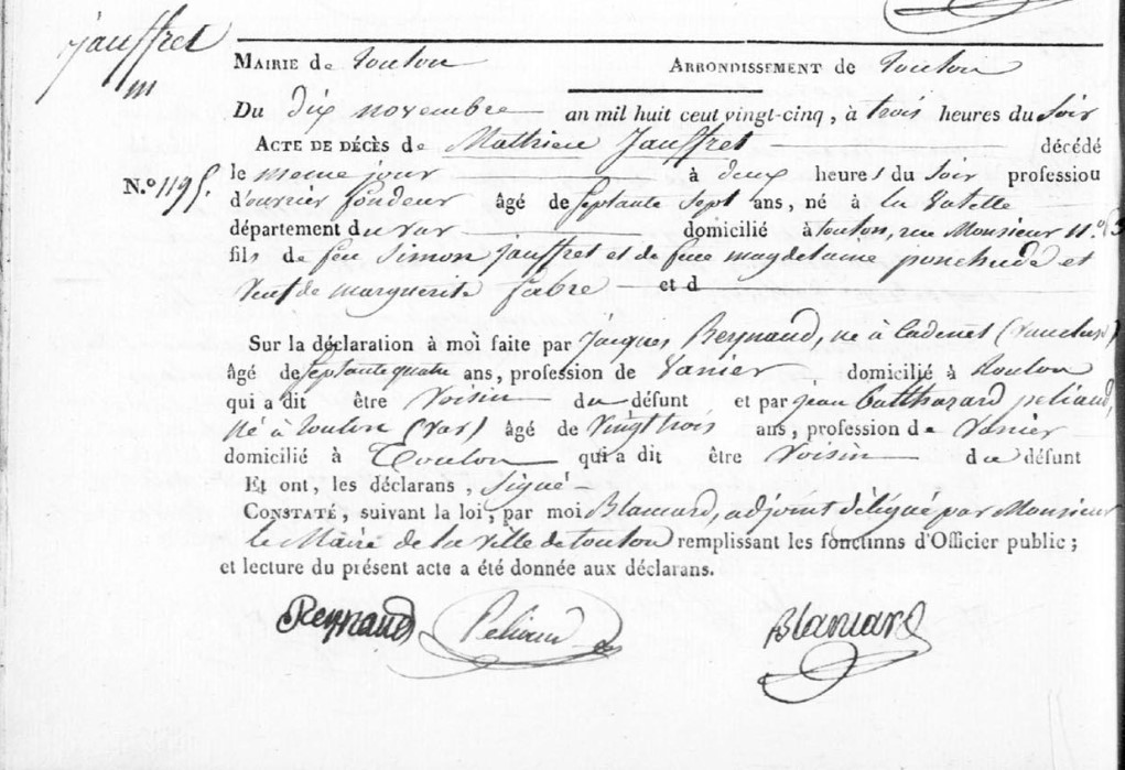 Naissance : 1748 à La Valette-du-Var 83160 Décès : 10 novembre 1825 à Toulon 83000 63, rue Monsieur