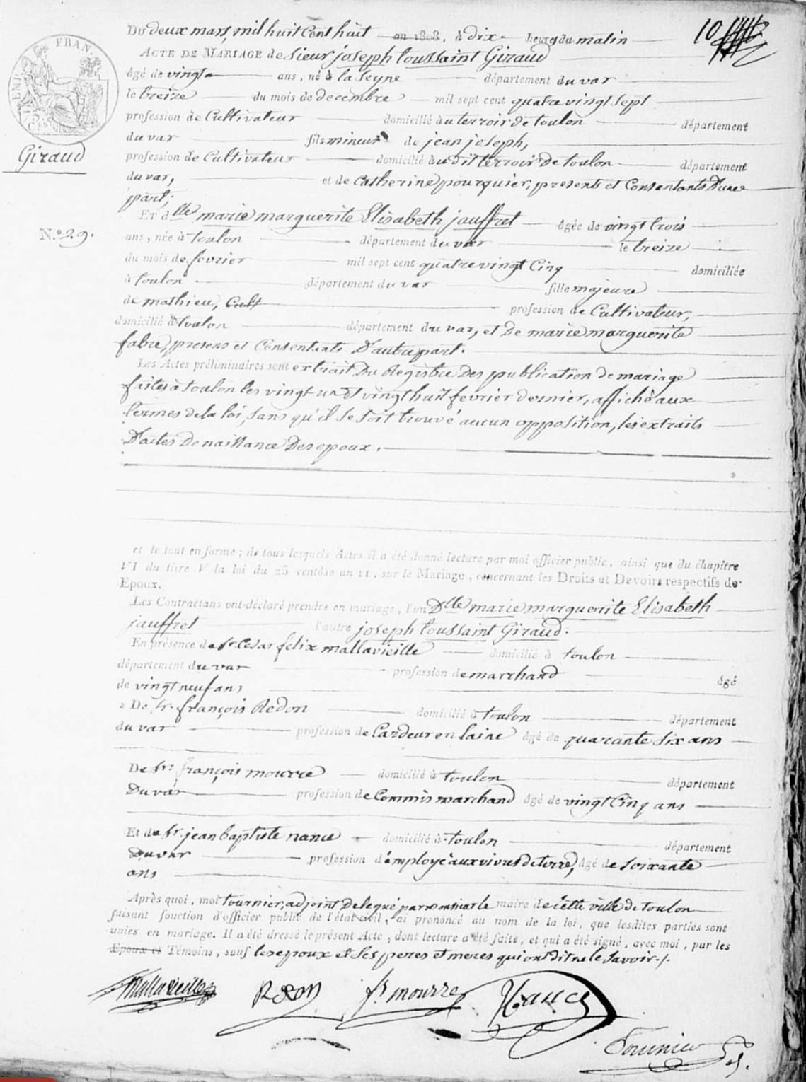 Union : GIRAUD Joseph Toussaint ( 1787 - ? )