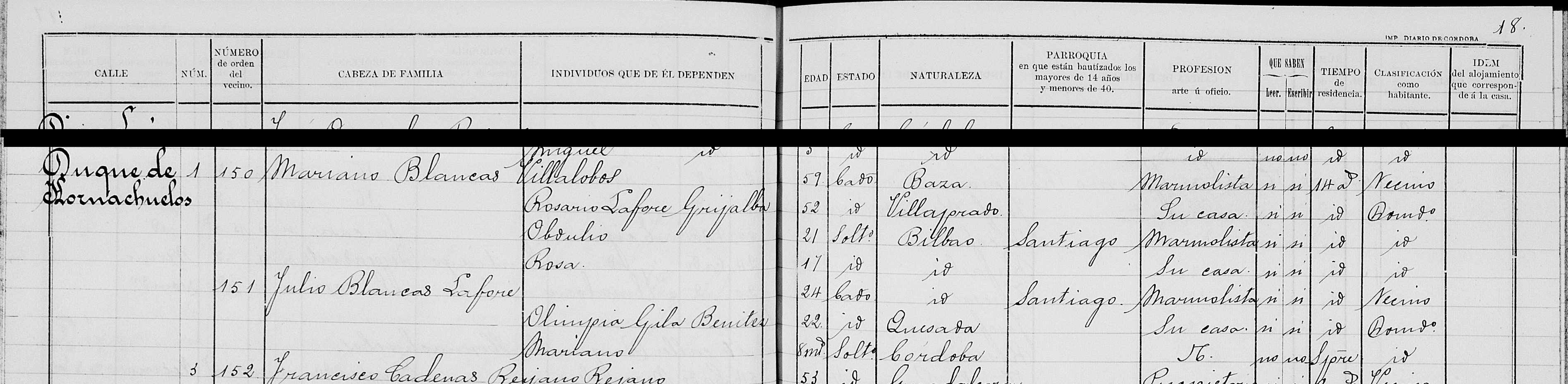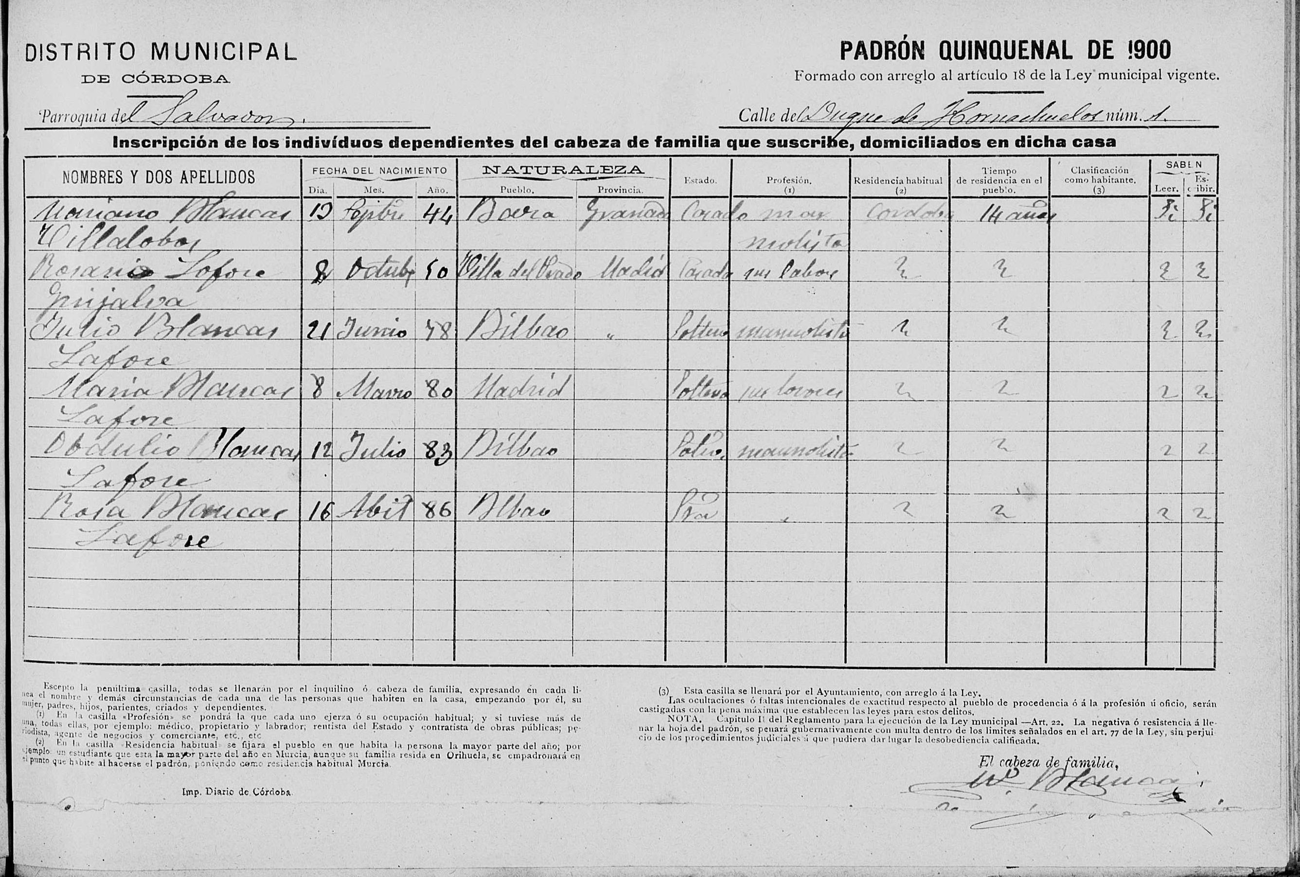 Domicile : de 1900 à 1904 à Córdoba 14001 calle Duque de Hornachuelos,1