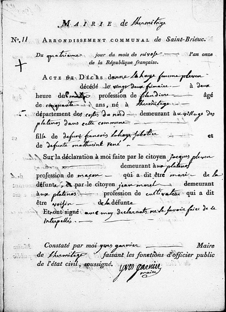 Naissance : 1752 à L'Hermitage-Lorge 22150 Décès : 13 décembre 1802 à L'Hermitage-Lorge 22150 village des Platenos