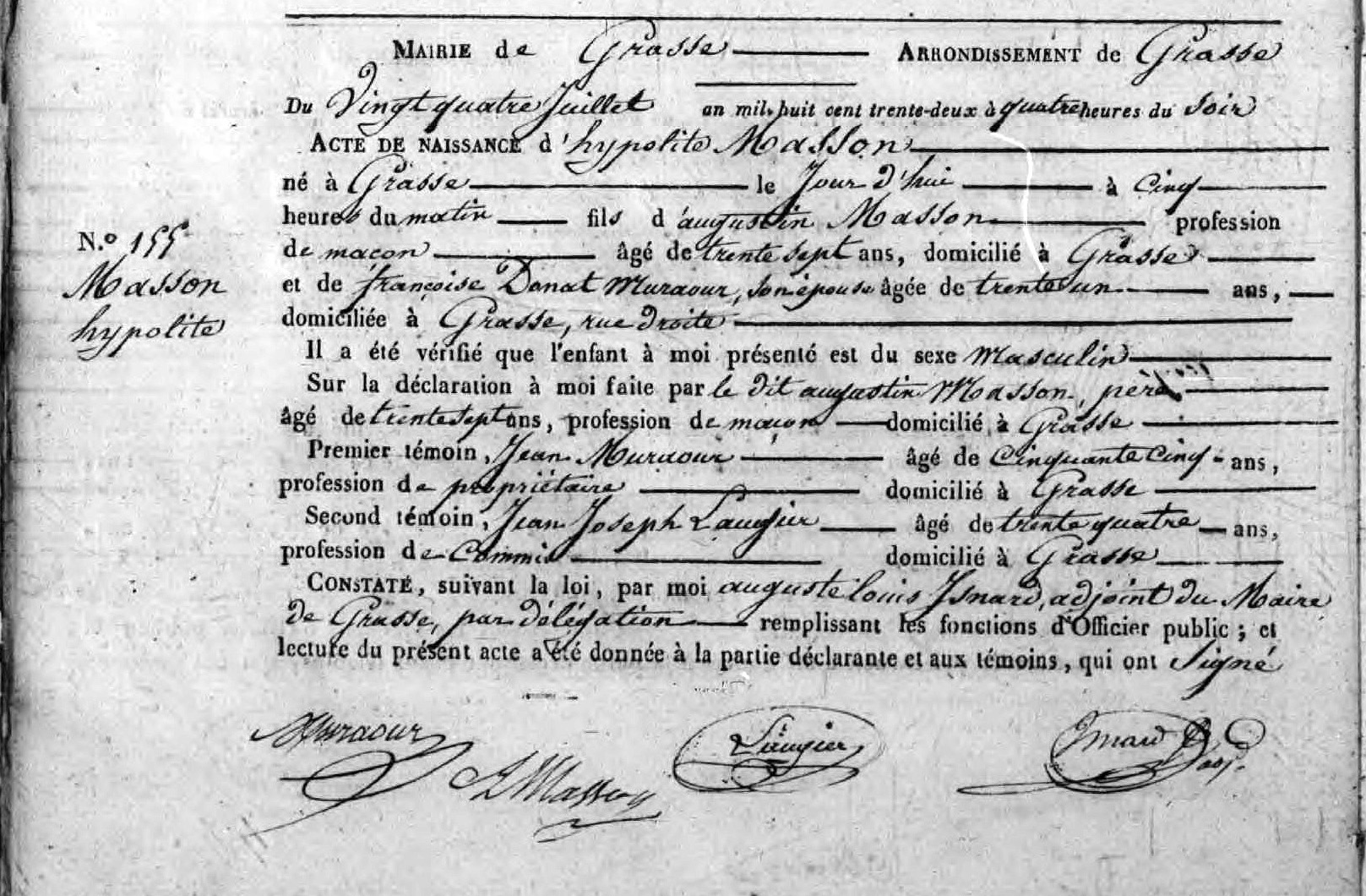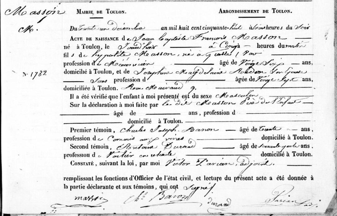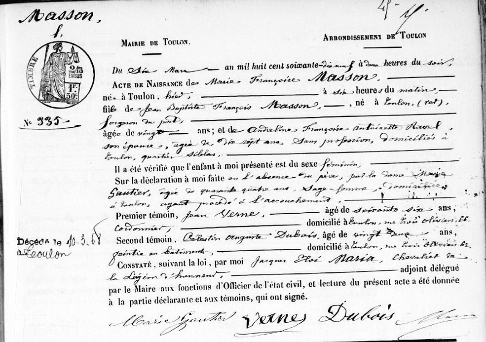 Naissance : 30 décembre 1858 à Toulon 83000 9 rue Mairaud