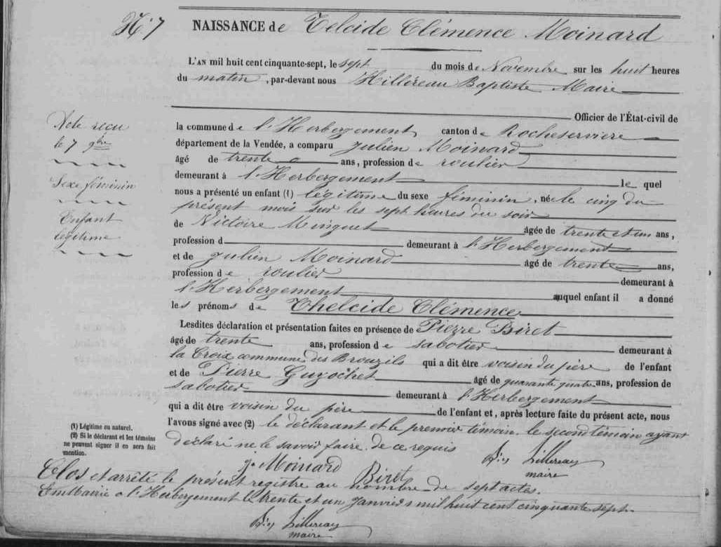 Naissance : 5 novembre 1857 à L'Herbergement 85260