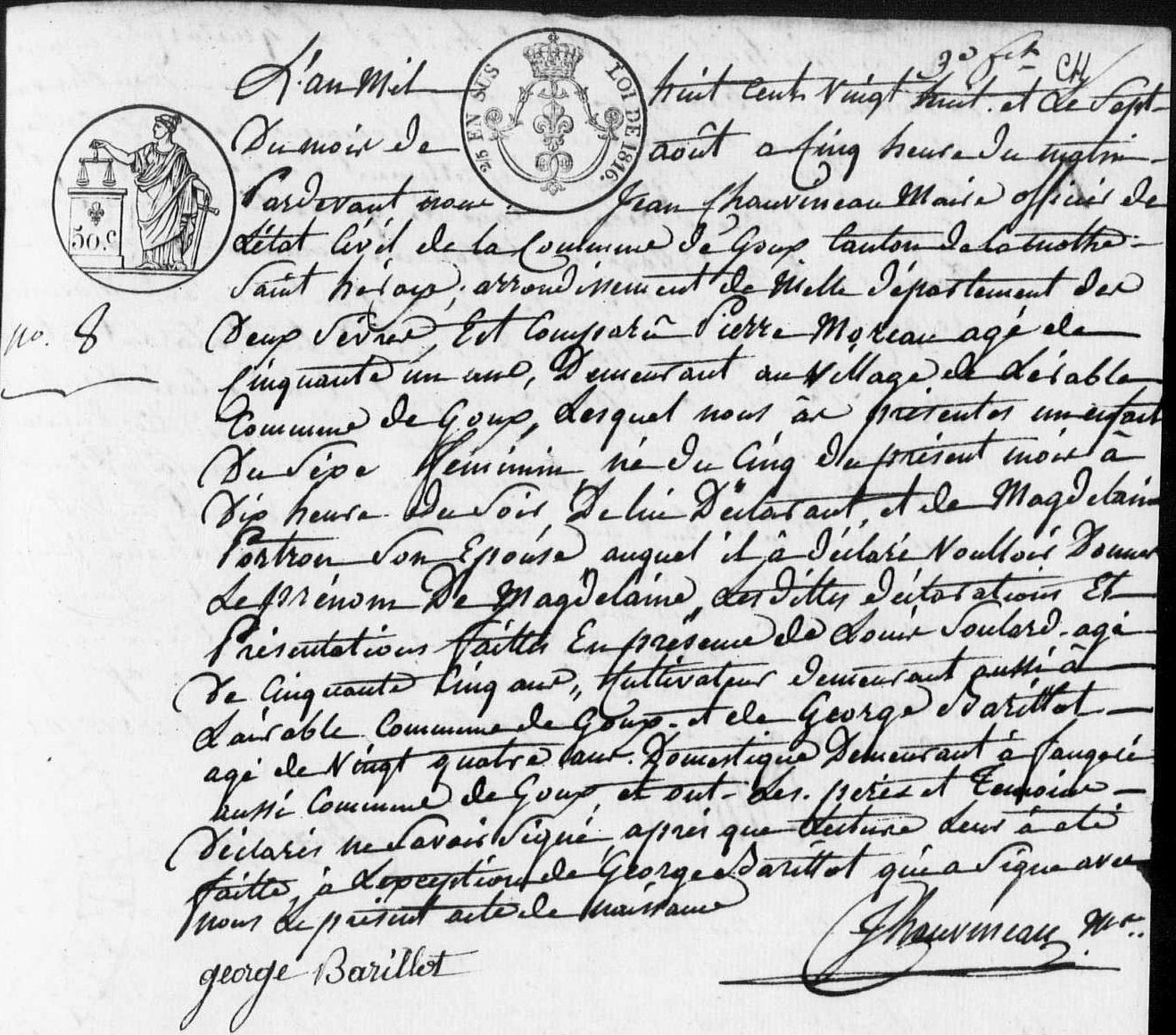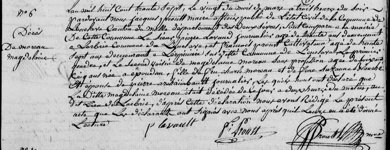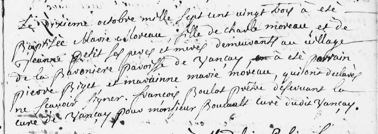 Naissance : 10 octobre 1723 à Vançais 79120 la Bavonière