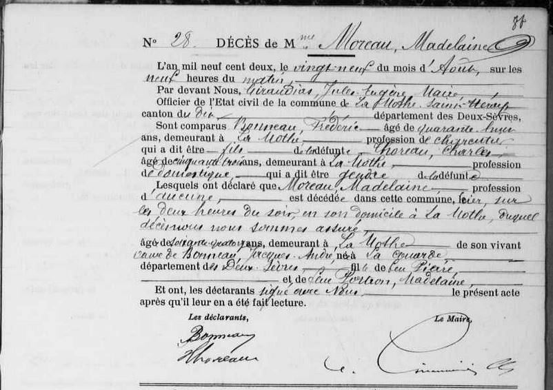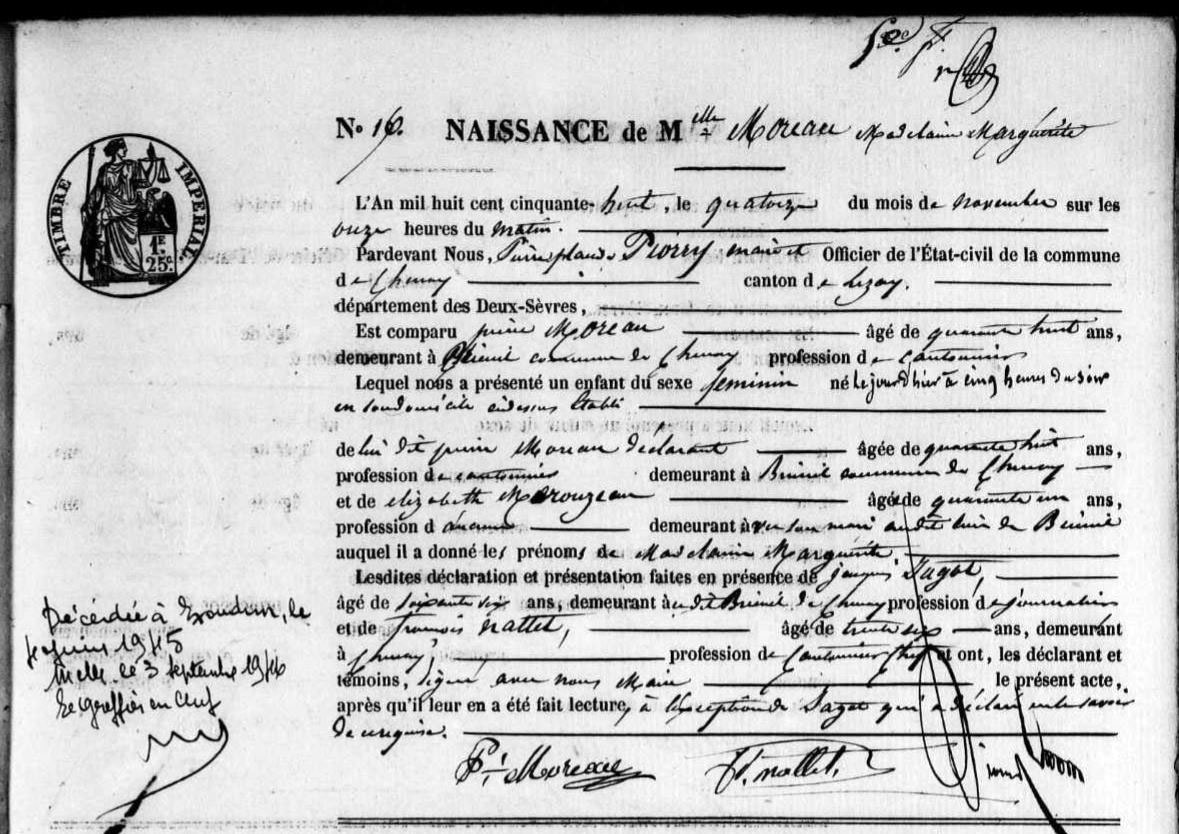 Naissance : 13 novembre 1858 à Chenay 79120 Breuil