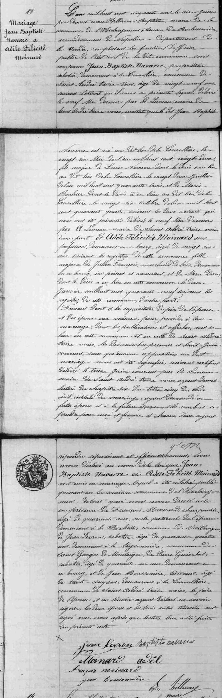 Naissance : 26 mai 1822 à Saint-André-Treize-Voies 85260 la Courollière
