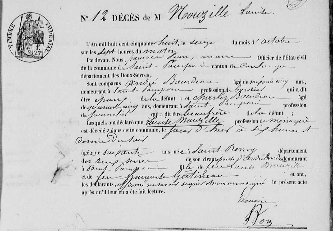 Naissance : 1797 à Saint-Rémy 79410 Décès : 15 octobre 1858 à Saint-Pompain 79160