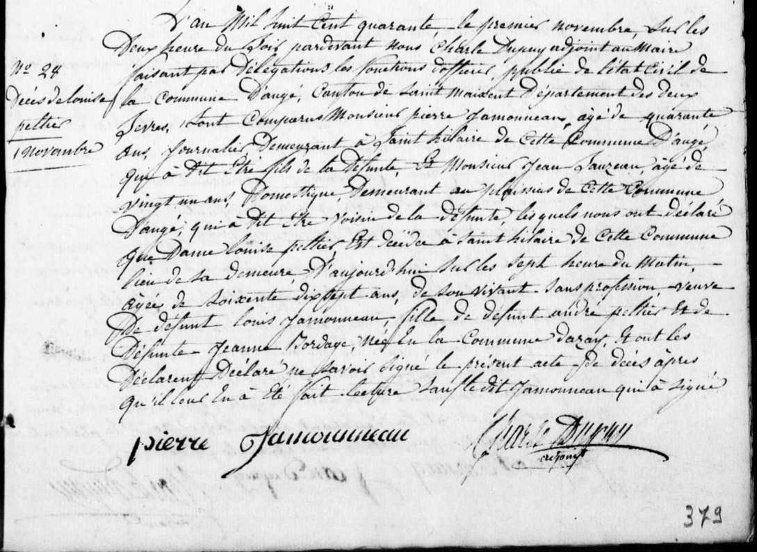 Naissance : 1763 à Azay-le-Brûlé 79400 Décès : 1er novembre 1840 à Augé 79400