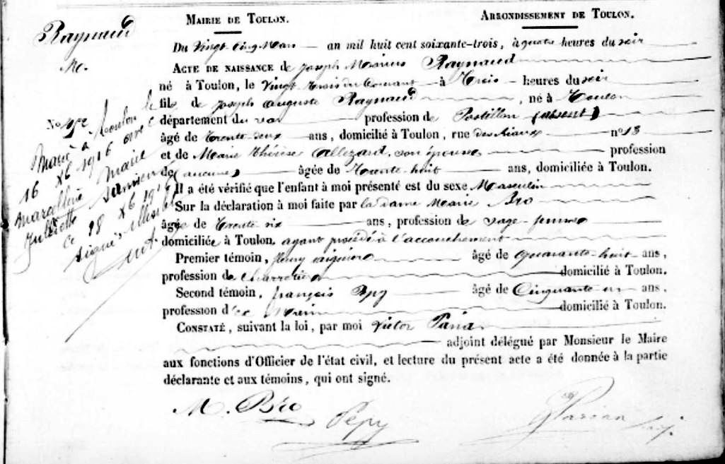 Naissance : 23 mars 1863 à Toulon 83000 rue des Riaux